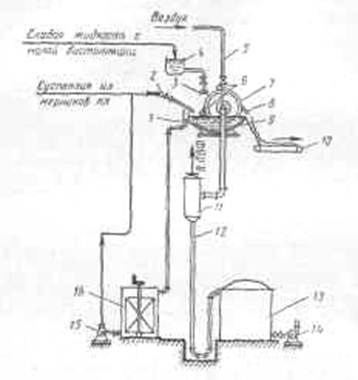 Суспензия бикарбоната натрия из мерников карбонизационных колонн поступает в коллектор 2, распределяющий ее по отдельным фильтрам. Из коллектора 2 суспензия самотеком подается в корыто 9 вакуум-фильтра, имеющее мешалку 1. Фильтрующий барабан 7 примерно на 1/3 погружен в суспензию NaHCO3, находящуюся в корыте 9. Для нормальной работы фильтра важно, чтобы высота погружения фильтрующего барабана в суспензию оставалась неизменной. Избыток суспензии из корыта 9 непрерывно через перелив перетекает в сборник 16 с мешалкой. Из сборника 16 насос 15 возвращает суспензию в коллектор2. Качающаяся мешалка 1 не позволяет частицам NaHCO3 оседать на дно корыта 9. Через фильтрующую ткань под влиянием вакуума внутрь барабана проходят жидкость, промывная вода и воздух.