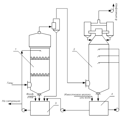 1 – абсорбер с плавающей насадкой; 2 – полая башня; 3 – емкость для фосфорной кислоты;