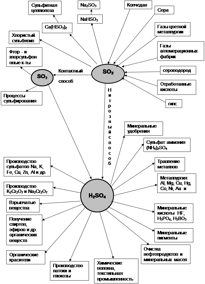 В настоящее время серная кислота производится двумя способами: нитрозным, существующим более 200 лет, и контактным, освоенным в промышленности в конце ХIХ и начале ХХ века. Контактный способ вытесняет нитрозный (башенный). Первой стадией сернокислотного производства по любому методу является получение диоксида серы при сжигании сернистого сырья. После очистки диоксида серы (особенно в контактном методе) ее окисляют до триоксида серы, который соединяют с водой с получением серной кислоты. Окисление SO2 в SO3 в обычных условиях протекает крайне медленно. Для ускорения процесса применяют катализаторы.