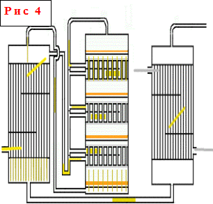 Контактный узел (Рис. 3: 6,7,8) состоит из контактного аппарата, кожухотрубного теплообменника и не показанного на схеме (Рис. 4). огневого пускового подогревателя газа. В теплообменнике пускового подогревателя газ нагревается перед поступлением в аппарат при пуске или при падении температуры в аппарате ниже нормы. Обычно применяются полочные контактные аппараты. Такой аппарат имеет цилиндрический корпус диаметром от 3 до 10 и высотой 10-20 м. Внутри корпуса установлены четыре-пять решеток со слоем гранул контактной массы на каждой из них. Между слоями контактной массы установлены промежуточные трубчатые или коробчатые теплообменники. На схеме представлен четырехслойный контактный аппарат, хотя чаще применяются пятислойные аппараты, но принцип их дествия полностью аналогичен, разница лишь в еще одном слое ктализатора. Свежий газ подогревается за счет тепла прореагировавшего горячего газа сначала во внешнем теплообменнике, потом он частично или полностью проходит для подогрева последовательно три-четыре внутренних теплообменника, при 440-450 оС поступает в первый слой контактной массы. Эта температура регулируется открыванием задвижек. Главное назначение внутренних теплообменников - охлаждение частично окисленного и разогретого в слое катализатора газа, таким образом, чтобы режим ступенчато приближался к кривой оптимальных температур.