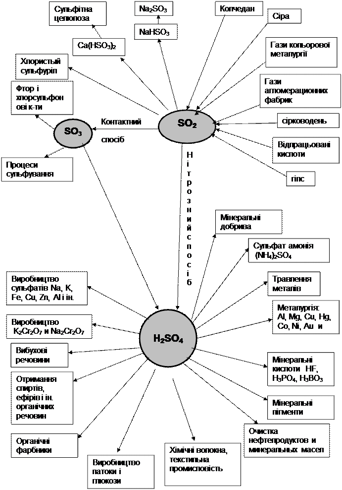 Сірчана кислота – найбільш сильна і найдешевша кислота. Серед мінеральних кислот, вироблюваних хімічною промисловістю, сірчана кислота за об'ємом виробництва і споживання займає перше місце. Сірчана кислота не димить, в концентрированному вигляді не руйнує чорні метали, в той же час є однією з найсильніших кислот, в широкому діапазоні температур (від – 40 - 20 до 260 – 336,5 °С) знаходиться в рідкому стані. Вона широко використовується у виробництві мінеральних добрив, різних солей і кислот, всіляких органічних продуктів, барвників, димообразуючих і вибухових речовин і т.д. Сірчана кислота знаходить різноманітне застосування в нафтовій, металургійній, металообробній, текстильній і інших галузях промисловості, використовується як водовідштовхувальний і осушуючий засіб, застосовується в процесах нейтралізації, труїть і т.д. Найбільш важливі області застосування сірчаної кислоти відбиті на схемі.