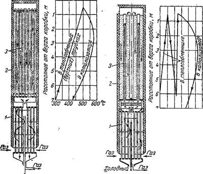 Рис. VI-10. Противоточная насадка Рис. VI-11. Прямоточная насадка (здесь и на рис. VI-!! —VI-13 спра- с двойными теплообменными трубками ва изображены графики распределения температур в катализаторной коробке):