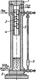 Жидкий аммиак подается в испаритель (конденсатор) снизу, газообразный испарившийся аммиак отводится по трубке в ловушку /. Здесь задерживаются капли жидкого аммиака, уносимые газом; жидкость стекает обратно в аппарат через вертикальную трубу 5.