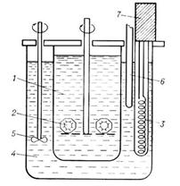 Рис. 3.3 – Схема низкотемпературного кристаллизатора: 1 – раствор; 2 – кристалл; 3 – печь; 4 – термостат; 5 – мешалка; 6 – контактный термометр; 7 – терморегулятор.