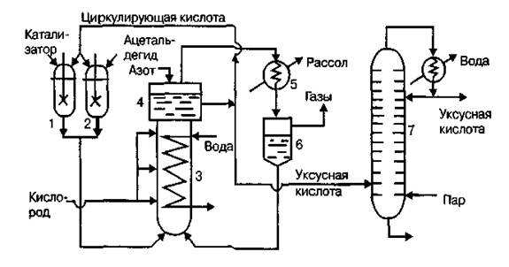 Растворы катализатора и ацетальдегида в циркуляционной уксусной кислоте подаются из смесителей 1 и 2 в нижнюю часть окислительной колонны — реактора барботажного типа 3. Температурный режим в колонне поддерживается с помощью размещенных в ней охлаждающих змеевиков, по которым циркулирует вода. По всей высоте в колонну через несколько труб подается под давлением 4*105 Па кислород, который барботирует через жидкость, заполняющую колонну. Парогазовая смесь, содержащая продукты окисления, выводится из колонны 3 через брызгоуловитель 4 и поступает в конденсатор 5, охлаждаемый рассолом, и из него в сепаратор 6. Из сепаратора конденсат, состоящий из уксусной кислоты и ацетальдегида, возвращается в окислительную колонну, а несконденсировавшиеся газы промываются водой и выпускаются в атмосферу. Для предотвращения возможности взрыва НУК парогазовая смесь, выходящая из колонны, разбавляется азотом, который подается в брызгоуловитель 4. Жидкая уксусная кислота, выходящая из брызгоуловителя колонны 3, делится на два потока. Меньший из них (циркуляционная кислота) направляется в смесители 1 и 2 для приготовления растворов катализатора и ацетальдегида, а больший поступает на ректификацию в колонну 7 для получения товарного продукта. Из нижней части колонны 7 выводится в виде кубового остатка раствор катализатора, поступающий на регенерацию.
