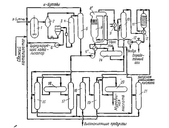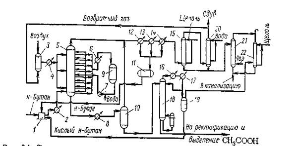 Свежий жидкий н-бутан подается в смеситель 1, куда поступают циркулирующий к-бутан из емкости 11 и так называемый кислый н-бутан из емкости 19. Смесь свежего и циркулирующего н-бутана и кислых продуктов, пройдя теплообменник 2, где она нагревается до 140—150 °С, поступает в нижнюю часть реактора окисления 5. Свежий воздух и кислородсодержащий газ из скруббера 20 смешиваются в аппарате 3, нагреваются в подогревателе 4 и тремя потоками подаются в реактор окисления 5. Реактор представляет собой аппарат колонного типа, в который вмонтированы змеевики для съема тепла и распределительное устройство для воздуха.