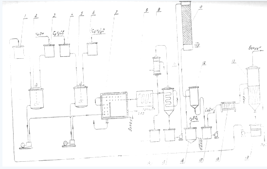 Свежая и обратная соляная кислота из напорного бака 2 поступает в испаритель 27. Образовавшиеся в нем пары соляной кислоты смешиваются в верхней части смесителя 1 с воздухом и в средней части с парами бензола. Получившаяся при этом паро-газовая смесь с температурой около 210°С поступает на хлорирование в трубчатый контактный аппарат 37, в межтрубном пространстве которого циркулирует высокотемпературный теплоноситель.