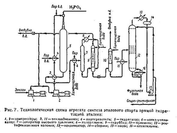 На рисунке приведена принципиальная технологическая схема агрегата синтеза этанола прямой гидратацией этилена. Свежий этилен под давлением 20 – 23 кгс/см2 поступает на приём компрессора 1, сжимается до 70 кгс/см2 и смешивается с циркулирующим этиленом. Газовая смесь циркуляционным компрессором 2 сжимается до 80 кгс/см2 и направляется в теплообменник 3, где подогревается за счёт тепла обратного газа.