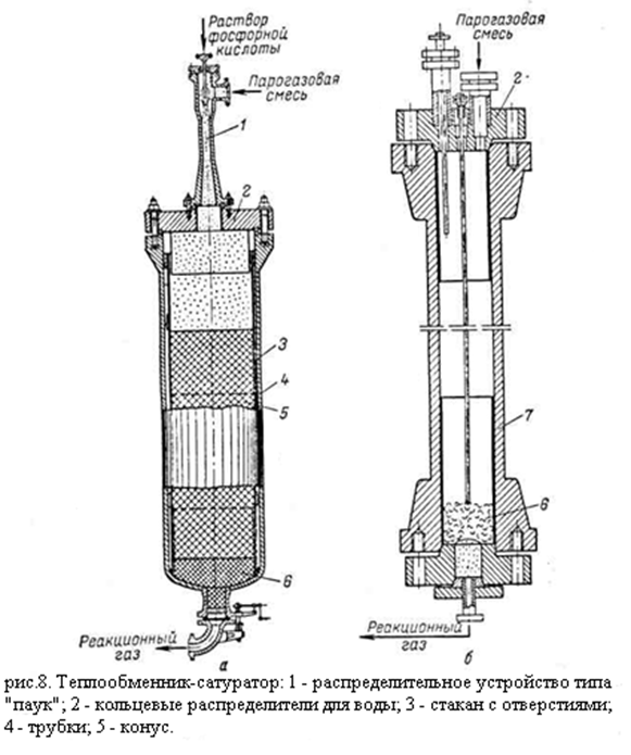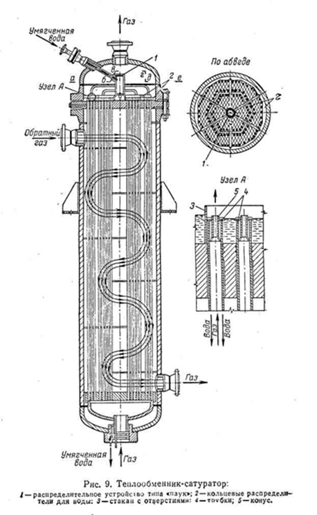 Теплообменник-сатуратор - вертикальный кожухотрубный аппарат, в котором прямой газ проходит по трубам, а обратный – по межтрубному пространству; прямой газ поступает снизу вверх. Вода подаётся сверху, распределяется по трубной решётке через специальное устройство – «паук», растекается по решётке и поступает в трубы через кольцевые зазоры между трубками и вставленными в их верхнюю часть конусами. Благодаря этому вода стекает тонкой плёнкой по поверхности трубок испаряясь и насыщая поднимающийся навстречу прямой газ. Насыщенный водой прямой газ через конусы попадает в пространство над трубной решёткой. Коэффициент теплопередачи в теплообменниках-сатураторах достигает 400 ккал/(м2 . ч . °C).[2,5]