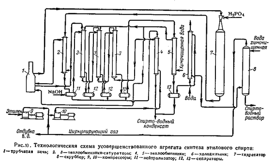 Компримированный этилен после компрессоров 9 и 10 поступают в теплообменник 4, где нагревается до 100 °C конденсатом после теплообменников-сатураторов (180°C). Далее этилен последовательно проходит теплообменники-сатураторы 3, орошаемые конденсатом. Насыщенный водой этилен при 200°C поступает в омеднённый теплообменник-сатуратор 2, а перед входом смешивается с частично испариной химически очищенной водой из теплообменника 5. Смесь при 215°C поступает в трубчатую печь 1, там догревается до 270 - 290°C и направляется в гидрататор 7, работающий в интервале 260 – 300°C. Обратный газ из гидратора проходит омеднённый теплообменник-сатуратор 2, где охлаждается до 240°C, и затем нейтрализуется щелочным раствором спирто-водного конденсата в нейтрализаторе 11; при этом температура снижается до 220 °C. Далее обратный газ последовательно проходит все теплообменники-сатураторы 3 и отделяется от жидкости в сепараторах 12, после чего при 130°C направляется на окончательное охлаждение в теплообменник 5 и холодильник 6 и поступает в скруббер 8 для отмывки спирта. Спирто-водный конденсат из сепараторов поступает в теплообменник 4. Все потоки спирто-водного конденсата и спирто-водный раствор после освобождения от растворённого этилена поступает затем на ректификацию.[2,4]