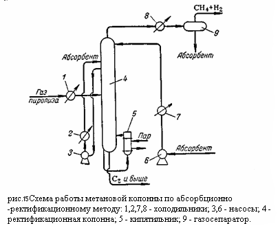 Представляет собой фракционирующий абсорбер (верх колонны работает как абсорбер, а низ – как отпарная колонна). Газ пиролиза перед поступлением в колонну 4 охлаждается в холодильнике 1 до -25°С. Извлечение компонентов тяжелее метана осуществляется путём орашения колонны 4 лёгким абсорбентом (фракция С4 из пропановой колонны), также охлаждённым до -25°С. Расход абсорбента достигает 1,35 кг на кг газа.