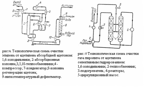 Очистка от ацетилена может осуществляться промывкой ацетоном при низких температурах либо, чаще всего, селективным гидрированием. Содержание ацетилена в газе пиролиза колеблется от 0,1 до 1%. При очистке оно должно быть снижено до 0,001 – 0,002 %.