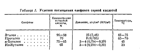 Видно, что с увеличением молекулярного веса олефинов их реакционная способность возрастает. Олефины изостроения также обладают очень высокой реакционной способностью. Поскольку олефины в зависимости от молекулярного веса и строения реагируют с серной кислотой с разной скоростью, для каждого из них подбирают свои условия: концентрация кислоты, температуру, давление.