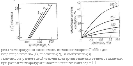 Как показывает стехиометрия реакций, на их равновесие можно влиять, изменяя давление. Внутримолекулярной дегидратации, идущей с увеличением числа молей веществ, способствует пониженное или обычное давление. Наоборот, гидратации олефинов благоприятствует высокое давление, увеличивающее равновесную степень конверсии олефина. Так последняя при 250 – 300 *С и атмосферном давлении составляет всего 0,1 – 0,2%, что совершенно неприемлемо для практических целей, но при 7 – 8 МПа и тех же температурах она возрастает до 12 – 20%. Зависимость равновесной степени конверсии этилена при его гидратации от давления и температуры изображена на рис.60, причём аналогичные кривые характерны и для других олефинов. Очевидно, что гидратации способствуют одновременное снижение температуры и повышение давления. Рассмотрим теперь равновесие в системе межмолекулярная дегидратация спиртов – гидролиз простых эфиров. Термодинамическим методом регулирования направления этих реакций является изменение давления: на образование простого эфира оно не влияет, но получению олефина его снижение благоприятствует.