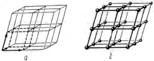 Пространственная решетка. Понятие об элементарной ячейке. Уже давно в кристаллографии наметилась тенденция объяснять симметрию формы и свойства кристаллов тем, что кристалл слагается из более мелких «кирпичиков», несущих в себе все элементы его симметрии. Мысленное дробление его приводит, в конце концов, к некоторому элементарному многограннику (рис. 1, а), сохраняющему все элементы симметрии и структуры исходного кристалла и теряющему эти свойства при дальнейшем дроблении. Однако теория впоследствии эволюционировала к представлениям о пространственной решетке как бесконечной системе узлов, составляющих бесконечные ряды плоских сеток (рис. 1, b), что позволило создать теорию кристаллической структуры в ее современном виде.