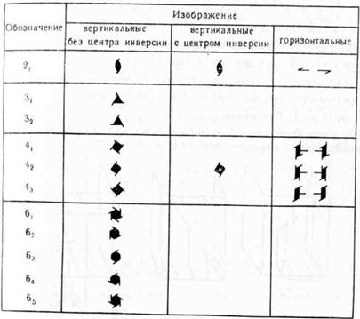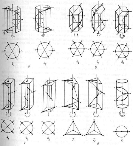 ,63, 64 и 65 проекции точек на плоскость, перпендикулярную оси, во всех случаях одинаковы и оси по этому признаку неразличимы. Лишь изучение разреза параллельно оси позволяет установить, с какой осью мы имеем дело. То же относится к винтовым осям других