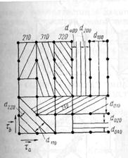 . Это же вытекает и из (11). Таким образом, наибольшими в данном случае являются расстояния d110. В случае F-решетки атомы лежат не только в плоскостях (200), но и (220). В этом случае наибольшим реальным является расстояние d111, следующим оказывается d200 и еще меньше d220. Естественно, это следует и из (11).