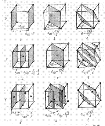 На рис. 20 представлены межплоскостные расстояния в кубических Р-, I и F-решетках. Из рисунка видно, что в случае Р-решетки наибольшим является расстояние d100. На основании формулы (11) это же межплоскостное расстояние должно было бы быть наибольшим реальным и для объемноцентрированной I- и для гранецентрированной F-решетки. Однако из рис. 20 видно, что это не совсем так. В случае I-решетки в центре элементарной ячейки имеются атомы, т. е. параллельно плоскостям (100) проходят плоскости (200), расстояния между которыми равны