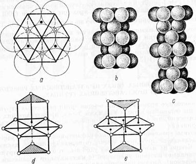 Плотные упаковки.Если условно рассматривать атомы в кристалле как касающиеся друг друга шары, то возникает вопрос, каким образом можно их наиболее плотно уложить, т. е. создать структуру с максимально плотной упаковкой (с минимальным незанятым атомами объемом). Анализ приводит нас к выводу, что возможны только две исходные плотнейшие упаковки: кубическая и гексагональная. С ними мы уже поверхностно знакомы (рис. 11, е и d). Рассмотрим их подробнее.