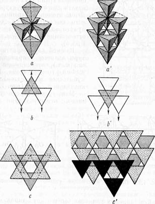 На рис. 22, а' показана «четырехэтажная» постройка кубической упаковки из тетраэдров, в которой тетраэдры соседних рядов повернуты вершинами в одну и ту же сторону (рис. 22,