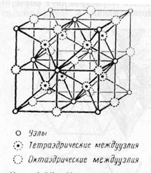 Октаэдрические междуузлия располагаются в центрах 12 ребер и в центре элементарной ячейки: всего их (12/4)+(1/1)=4 (т.е. столько же, сколько позиций атомов). Тетраэдрические междуузлия располагаются в центрах 8 октантов (кубов с ребром, равным а/2, т. е. объемом, равным 1/8 объема ячейки), всего их имеется в элементарной ячейке 8/1=8, т. е. вдвое больше, чем позиций атомов.