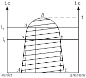 , то она пересечёт кривую АВС, то она пересечёт в точке а и в, а характеризует состав водного слоя, а в – состав анилинового слоя. Растворы, соответствующие по составам точкам А и В называются сопряжёнными, а отрезок АВ называется нодой. Если взять смеси анилина и воды состава тачки d и нагреть эту смеси до температуры