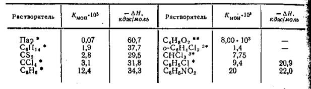 сероуглероде, четыреххлористом углероде, бензоле и диоксане, величины Кмон различается весьма существенно. В химически инертных по отношению к уксусной кислоте растворителях равновесие практически смещено в сторону димера. Величина Кмон в бензоле приблизительно на порядок выше, чем в остальных инертных растворителях, что обусловлено взаимодействием (впрочем, довольно слабым) кислоты с бензолом по π-связям последнего. В диоксане же, который является растворителем с отчетливо выраженными основными свойствами, равновесие уже значительно смещено в сторону мономера.