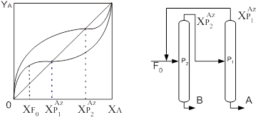 Рис.1. Разделение азеотропных смесей в комплексах, работающих под разным давлением