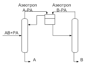 Метод азеотропной ректификации применим как для смесей с малым коэффициентом относительной летучести, так и для азеотропообразующих смесей (в том числе при составах, близких к азеотропу). При азеотропной ректификации разделяющий агент образует с каким-либо компонентом разделяемой смеси азеотроп с иным соотношением компонентов, нежели в исходной смеси, если последняя является азеотропообразующей. В качестве разделяющих агентов могут применяться вещества, образующие гомоазеотропы с компонентами исходной смеси (это могут быть азеотропы с максимумом или минимумом температур кипения), либо гетероазеотропы, представляющие собой тройные смеси разделяемых компонентов А и В с разделяющим агентом РА. Во всех случаях один из компонентов разделяемой смеси в колонне азеотропной ректификации может быть получен в практически чистом виде [10].