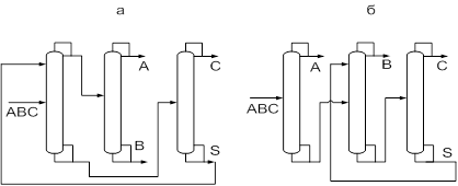 Рис. 4. Схемы экстрактивной ректификации трехкомпонентной смеси при выделении в первой колонне индивидуального азеотропообразующего компонента