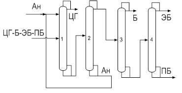 Принципиальная технологическая схема ректификации азеотропной смеси циклогексан-бензол–этилбензол–н-пропилбензол с использованием анилина в качестве разделяющего агента приведена на рис.7.