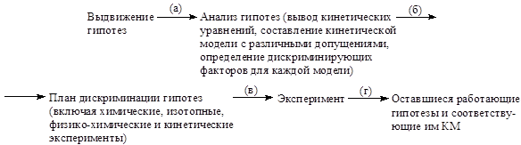 Главный недостаток этой процедуры (стратегии) – отсутствие алгоритмов однозначного выполнения всех этапов. Поскольку эксперимент может быть адекватно описан большим числом математических моделей (уравнений), исследователь должен иметь какую-либо гипотезу о схеме механизма (о структуре механизма) или о форме предполагаемых уравнений. При этом подбор возможных гипотез (иногда интуитивный) происходит уже после сделанного эксперимента. Нет алгоритма перехода от математической модели к физической модели (особенно для многомаршрутных реакций) (этап (б)). Переход к механизму реакции (этап (в)) также произволен и не формализован. На всех этапах этой стратегии присутствует естественное стремление получить хотя бы одно уравнение (и "схему механизма"), не противоречащее эксперименту, и, очень часто, ни о какой дискриминации набора гипотез не идет речи. Напротив, авторы такой схемы механизма начинают ставить эксперименты, чтобы доказать механизм, представляющийся автору наиболее разумным. Вместе с тем, уже давно установлено, что доказать какую-либо гипотезу нельзя. Можно доказательно отбросить неработающие гипотезы и показать согласие с экспериментом оставшихся гипотез – множества работающих гипотез. Целесообразность выдвижения набора гипотез и получение множества работающих гипотез была убедительно обоснована более 100 лет назад американским ученым-геологом Т.Чемберленом.