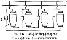 Группа последовательно соединенных аппаратов (рис. 6.6) носит название батареи. Для поддержания соответствующего температурного режима между каждой парой диффузоров может устанавливаться теплообменник.