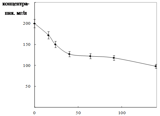 Как показано на рисунках 13 и 14, рост культуры на питательной среде, содержащей пинаколиловый эфир МФК, также характеризуется непродолжительной лаг-фазой, однако биодеструкция эфира происходит интенсивнее: концентрация пинаколилового эфира МФК уменьшается в 1,7 раза в течение 50 – 70 часов.