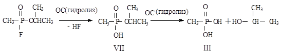 Гидролиз зарина протекает в две стадии. На первой быстрой стадии образуется изопропиловый эфир МФК (VII). Вторая стадия идет медленнее с образованием МФК (III) и изопропанола (рисунок 2). Продукты гидролиза зарина малотоксичны.