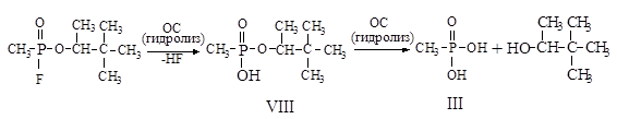 Зоман более устойчив к действию воды, чем зарин. Гидролиз зомана идет и в кислых, и в щелочных средах. Согласно [22] время 50 % -го гидролиза при 30 оС и величинах рН, равных 2, 4 и 7, составляет 6,4; 250 и 41 час соответственно. Согласно [26] период полуразложения при 25 оС и рН=6 составляет 60 часов. Время 50 % -го гидролиза при 20 оС и рН=7 по данным [22] составляет 82,5 часа. Гидролиз протекает в две стадии. На первой стадии образуется пинаколиловый эфир МФК (VIII), который далее медленно гидролизуется до МФК. При рН>10 гидролиз VIII осуществляется за несколько минут с образованием III. В почве зоман также разлагается за счет реакции гидролиза до соединений VIII и III. Схема реакции гидролиза зомана представлена на рисунке 3: