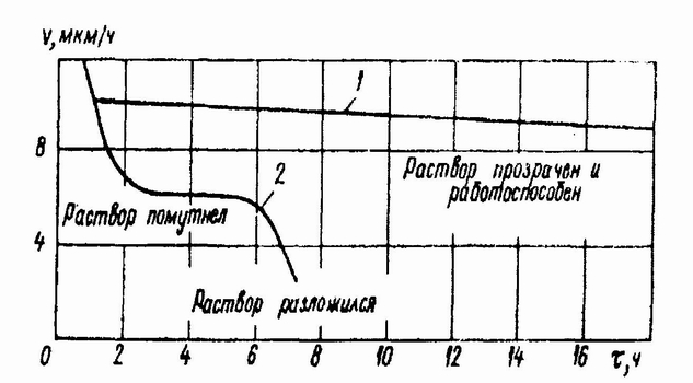 На рис. 6 показана зависимость работоспособности того же кислого раствора от наличия в нем малеинового ангидрида. Без него раствор при непрерывном снижении скорости через 7 ч работы полностью вышел из строя (кривая 1). Во втором случае его корректировали, перед очередным корректированием раствор фильтровали. В этом случае он проработал 22 ч при постоянной скорости реакции, оставаясь прозрачным и работоспособным (кривая 2).