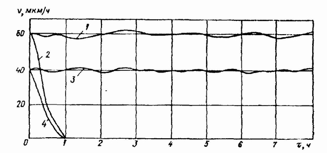 Рис. 7. Зависимость скорости осаждения покрытия от продолжительности никелирования в кислим растворе: 1 — с 15 мг/л сульфида свинца и корректированием; 2 — то же, без корректирования; З — с 15 мл/л аллилчена и корректированием; 4 — то же, без корректирования.