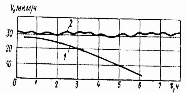 Рис. 8. Зависимость скорости осаждения покрытия в щелочном растворе от продолжительности никелирования: 1— без корректирования, 2 - с корректированием.