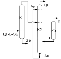 Исходная смесь подается в середину колонны К1, где в качестве куба выделяется ЭБ. Остальная смесь поступает в середину сложной колонны К2, а экстрактивный агент (анилин) подается наверх этой колонны. Дистиллятом является практически чистый циклогексан. Ниже точки питания в паровой фазе отбирается поток, который направляют в боковую исчерпывающую секцию К3, продуктом которой является бензол. Кубовый продукт сложной колонны представляет собой практически чистый анилин, который смешивают с небольшим количеством свежего экстрактивного агента и направляют на рецикл в сложную колонну.