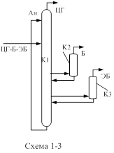 Видно, что структурой, обладающей минимальным энергопотреблением оказывается для состава питания ЦГ – Б – ЭБ = 10-80-10% мол. – схема 1-3, состоящая из одной сложной колонны с двумя укрепляющими секциями, представленная на рис.33.