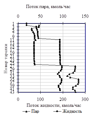 Рис.34. Профили температуры и потоков жидкости и пара сложной колонны, содержащей два боковых отбора. Состав исходного питания ЦГ – Б – ЭБ = 10 – 80 – 10% мол.