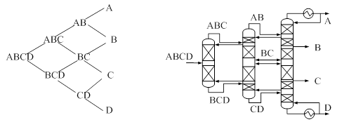 Рис.7. Суперструктура (а) и технологическая схема (б) разделения четырехкомпонентной смеси