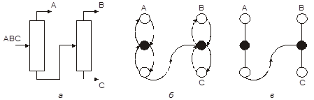 В данном методе используются ориентированные графы. При этом их вершинами выступают входы и выходы колонн, а ориентированными ребрами – потоковые связи. Тогда, схема ректификации (рис.8а) приобретает вид ориентированного мультиграфа с кратными разнонаправленными ребрами – образ секции колонны и одинарными ориентированными ребрами – образ потоковых связей между колоннами (рис.8б). Для упрощения структуры графа каждую кратную пару ребер можно заменить одним неориентированным ребром (рис.8в).