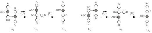 Рис.9. Преобразование графов, соответствующих схемам из простых колонн (G1, G4), в графы, соответствующие сложным колоннам с боковыми секциями (G2, G5) и с боковыми отборами (G3, G6).