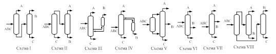 Систематический подход при разделении многокомпонентных смесей в структурах различных классов использован в [63]. Авторами исследовано разделение шести трехкомпонентных смесей для восьми вариантов технологических схем, включающих простые двухсекционные и сложные колонны рис.10.