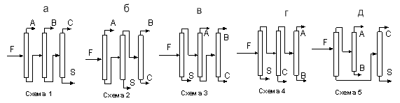 Рис.15. Схемы разделения (а-д) – четырехкомпонентной зеотропной смеси. А, В, С – компоненты смеси, S – тяжелокипящий агент, F – питание АВСS
