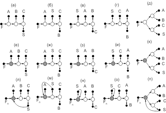 Связываем вершину S с помеченной вершиной-колонной ориентированным исходящим из S ребром и проверяем полученные структуры (рис.16 л-и) на работоспособность.