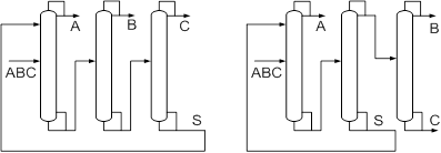 Синтезируем схемы ректификации четырехкомпонентной зеотропной смеси. Но, определяя последовательность выделения компонентов, необходимо рассмотреть возможность фракционирования исходной смеси на азеотропную и зеотропную составляющие. Видно, что компонент С (в нашем случае – этилбензол) может быть выделен и без применения экстрактивной ректификации. Из предложенных пяти возможных вариантов разделения только одна схема (рис.18) отвечает этому условию.