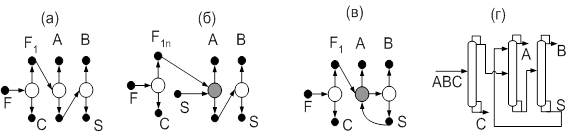 Рис.18. Графы (а-в) и технологическая схема (г) экстрактивной ректификации.